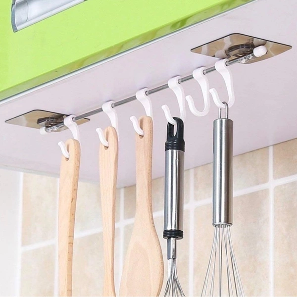 6-Hook Stainless Steel Kitchen Hanging Rack – Under Cabinet or Wall Mounted Utensil Holder with Adjustable Hooks, Self-Adhesive or Screw Installation, Space-Saving Rail Hanger