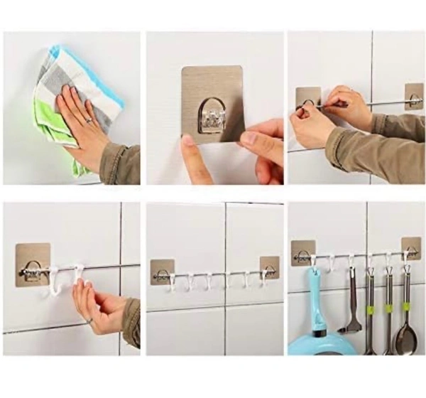 6-Hook Stainless Steel Kitchen Hanging Rack – Under Cabinet or Wall Mounted Utensil Holder with Adjustable Hooks, Self-Adhesive or Screw Installation, Space-Saving Rail Hanger