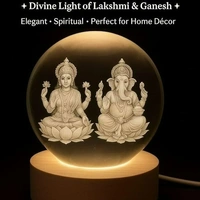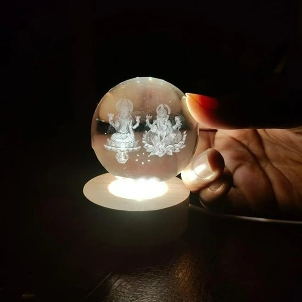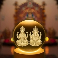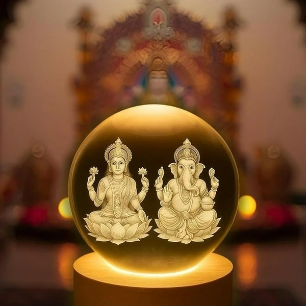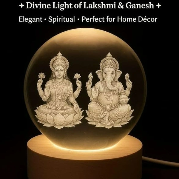 Featuring a stunning crystal ball engraved with intricate depictions of Goddess Lakshmi and Lord Ganesh, this lamp is a symbol of wealth, wisdom, and well-being. The warm glow from the crystal creates a serene ambiance, while the solid wooden base ensures a timeless aesthetic that complements any decor.